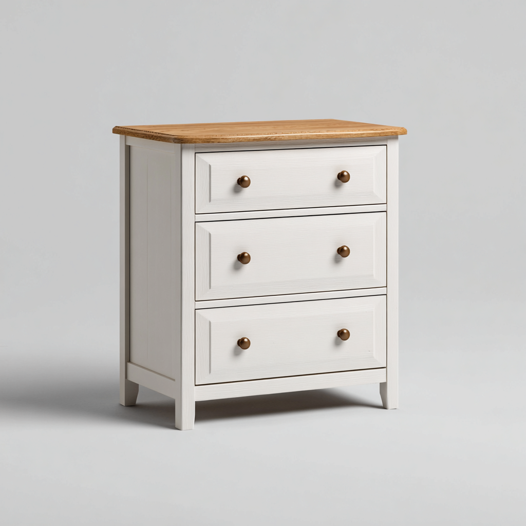 Cassettiera dallo stile sobrio e senza tempo pensata per l'arredo di camera da letto o zona giorno. Il contrasto tra la struttura chiara e il piano superiore naturale dona equilibrio visivo e rende il mobile adatto a contesti abitativi tradizionali e contemporanei.